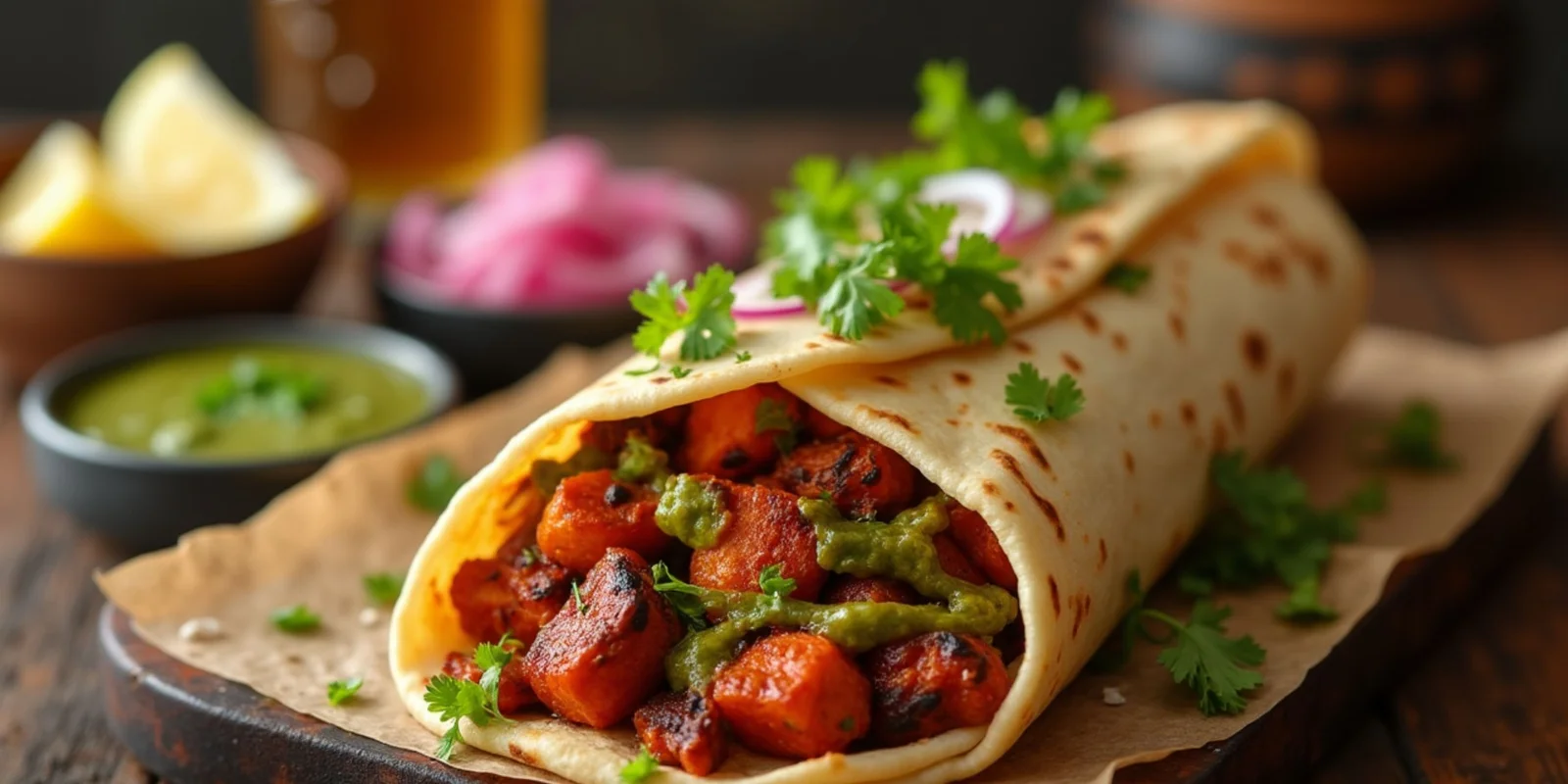 chaap pieces tossed in spicy chilli sauce and vegetables. Wrapped in a soft paratha, this roll offers bold and exciting flavours in every bite.Juicy soya chaap cooked in spicy chilli sauce with crunchy onions and capsicum, topped with creamy mayo and tangy chutneys, all wrapped in a soft rumali/roti for the perfect Delhi street-style roll.